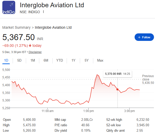 InterGlobe Aviation stock Rs 5,794 నుండి Rs 5,370 కి పడిపోయింది. ఒక్క వారం లోనే దాదాపు Rs 25,000 crore market cap కరిగిపోయింది.