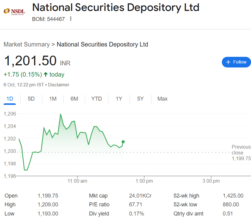 👉 NSDL IPO July 30, 2025 న launch అయ్యింది, August 6 న listing Rs 880 వద్ద. ఇప్పటి stock price (Oct 3, 2025) Rs 1199.75 వద్ద ఉంది, listing gain around 10%. NSDL past records కూడా consistent dividend payouts చూపిస్తాయి, investor confidence maintain అయ్యింది.