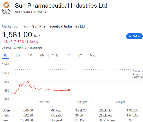 భారతీయ ఫార్మా రంగం (Indian Pharma sector) కి శుక్రవారం ఒక పెద్ద షాక్ తగిలింది. అమెరికా అధ్యక్షుడు Donald Trump ప్రకటించిన 100% tariff on branded & patented pharma drugs కారణంగా Nifty Pharma Index దాదాపు 3% పడిపోయింది 📉.