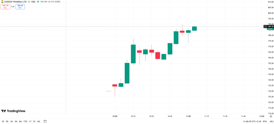 Listing day ఉదయం Sudeep Pharma IPO shares NSE, BSE మీద సుమారు ₹730–₹734 range లో open అయ్యాయి. Issue price ₹593 తో compare చేస్తే, ఇది దాదాపు 23–24% listing premium, అంటే decent short-term gain.