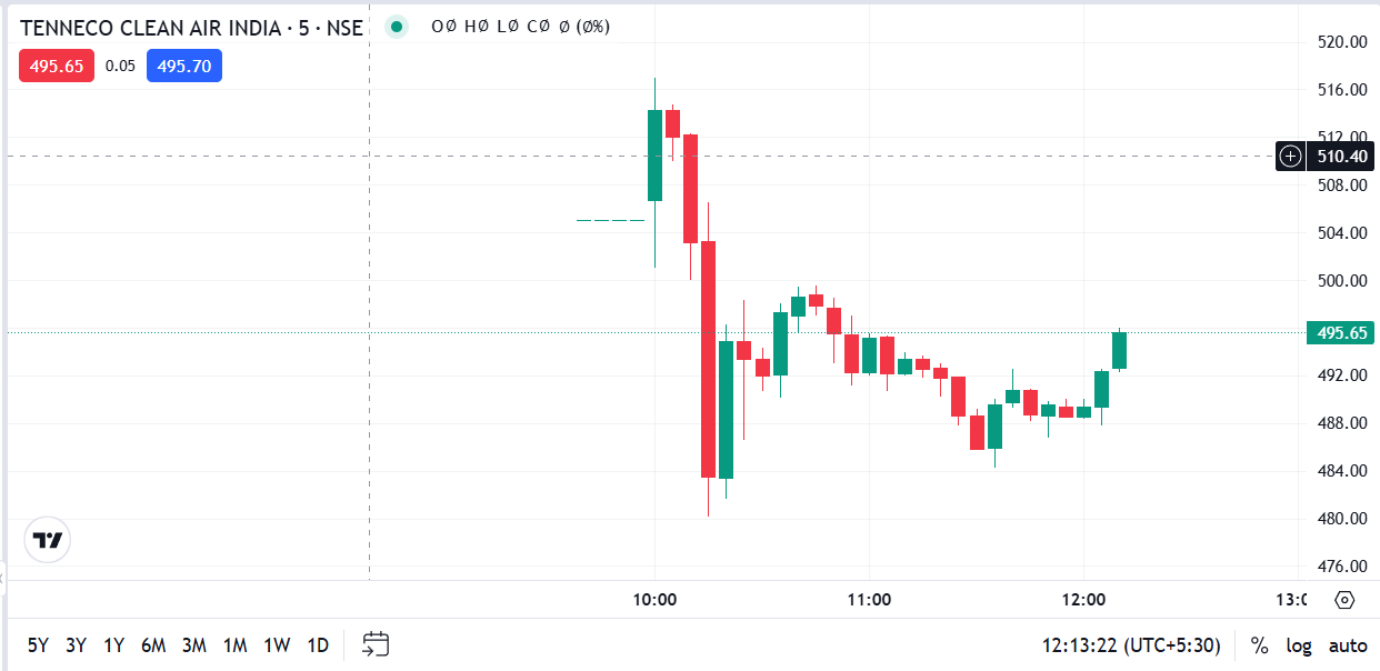 NSEలో Tenneco Clean Air India షేర్లు ₹505 వద్ద list అవ్వడంతో IPO issue price అయిన ₹397 పై సుమారు 27.20% listing gain వచ్చింది. BSEలో కూడా ₹498 listingతో around 25% gain ఇచ్చింది — అంటే strong debut confirmed! 🎉