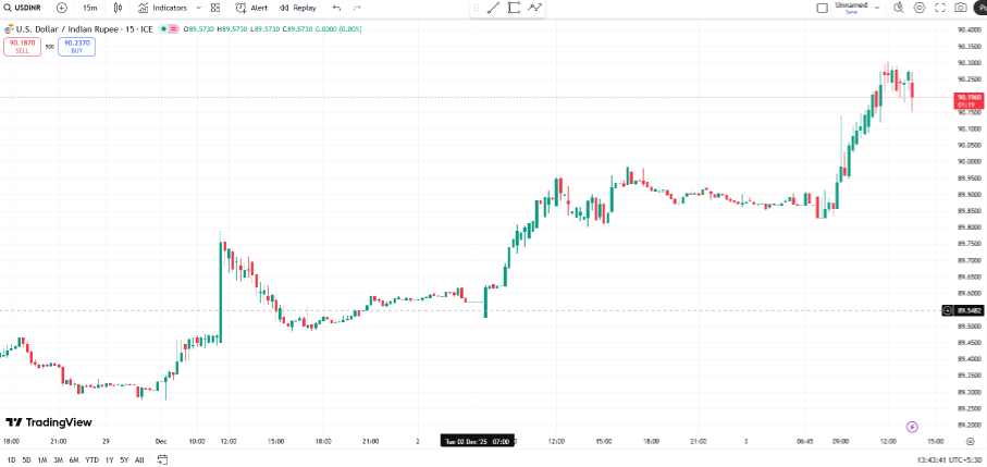 RBI నుంచి aggressive support కనిపించకపోవడం వల్ల USDINR pair downside కు వెళ్లింది. Market fear: “If RBI doesn’t intervene, ₹90+ levels may continue.”