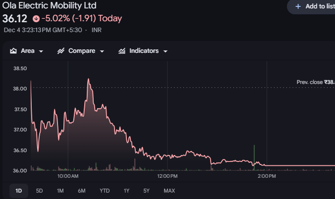Ola Electric share December 3rd న ₹36.36 వద్దకు పడిపోయింది — ఇది company 52-week low. 52-week range చూస్తే ₹36.26–102.50, అంటే stock ఈ సంవత్సరం 56–63% YTD down అయింది. గత నెలలోనే 25% correction వచ్చింది. Volumes కూడా unusualగా high — 30–39 million shares trade అయ్యాయి.